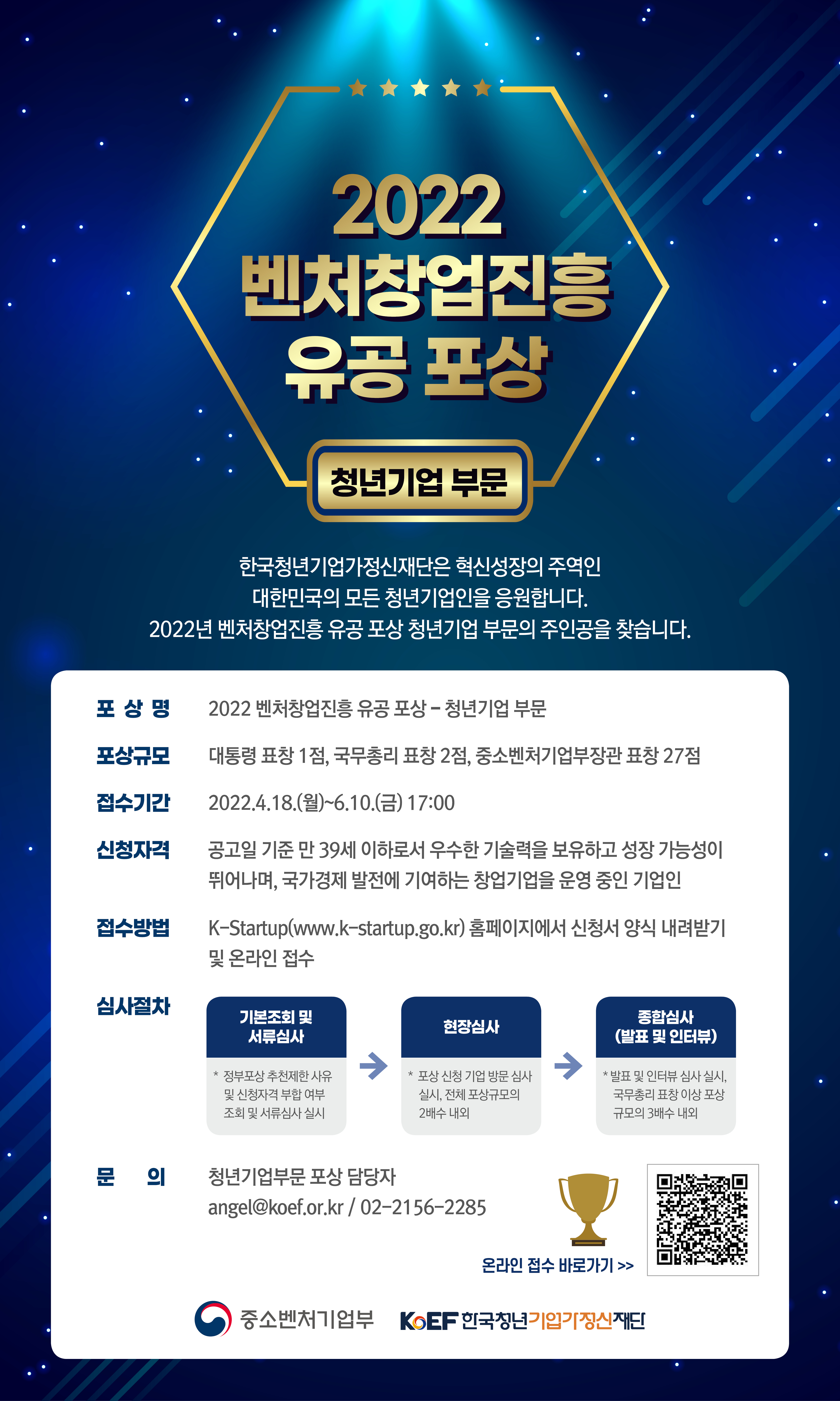 | [창업] 2022년 벤처창업진흥유공 포상 청년기업부문 신청 안내(~6/10 17시 마감) | ||
