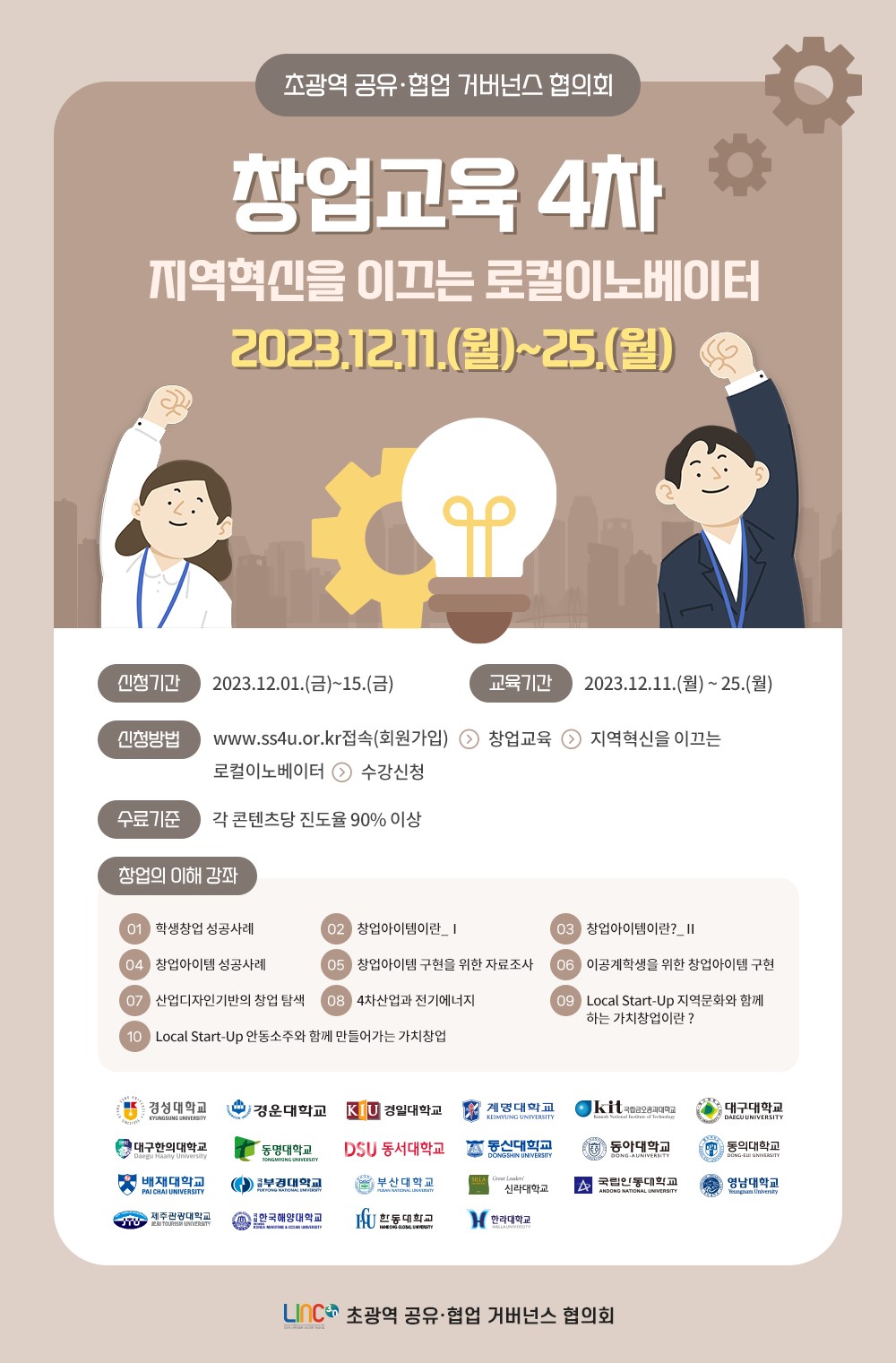 전국 22개 대학이 참여하는 ‘초광역 공유·협업 거버넌스 협의회’가 주관하는 온라인 창업교육을 운영하고 있습니다. 재학생 여러분의 많은 수강을 바랍니다.