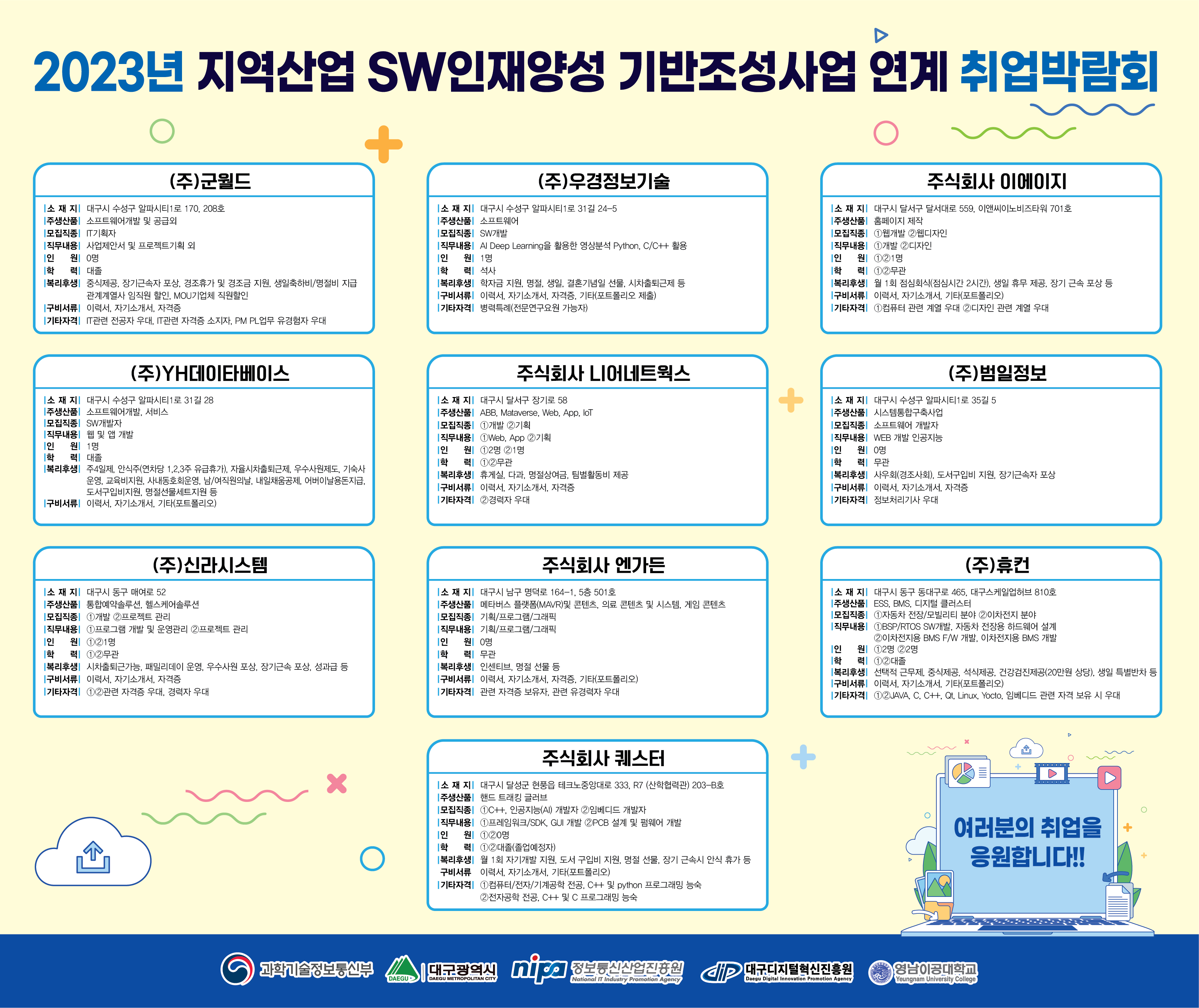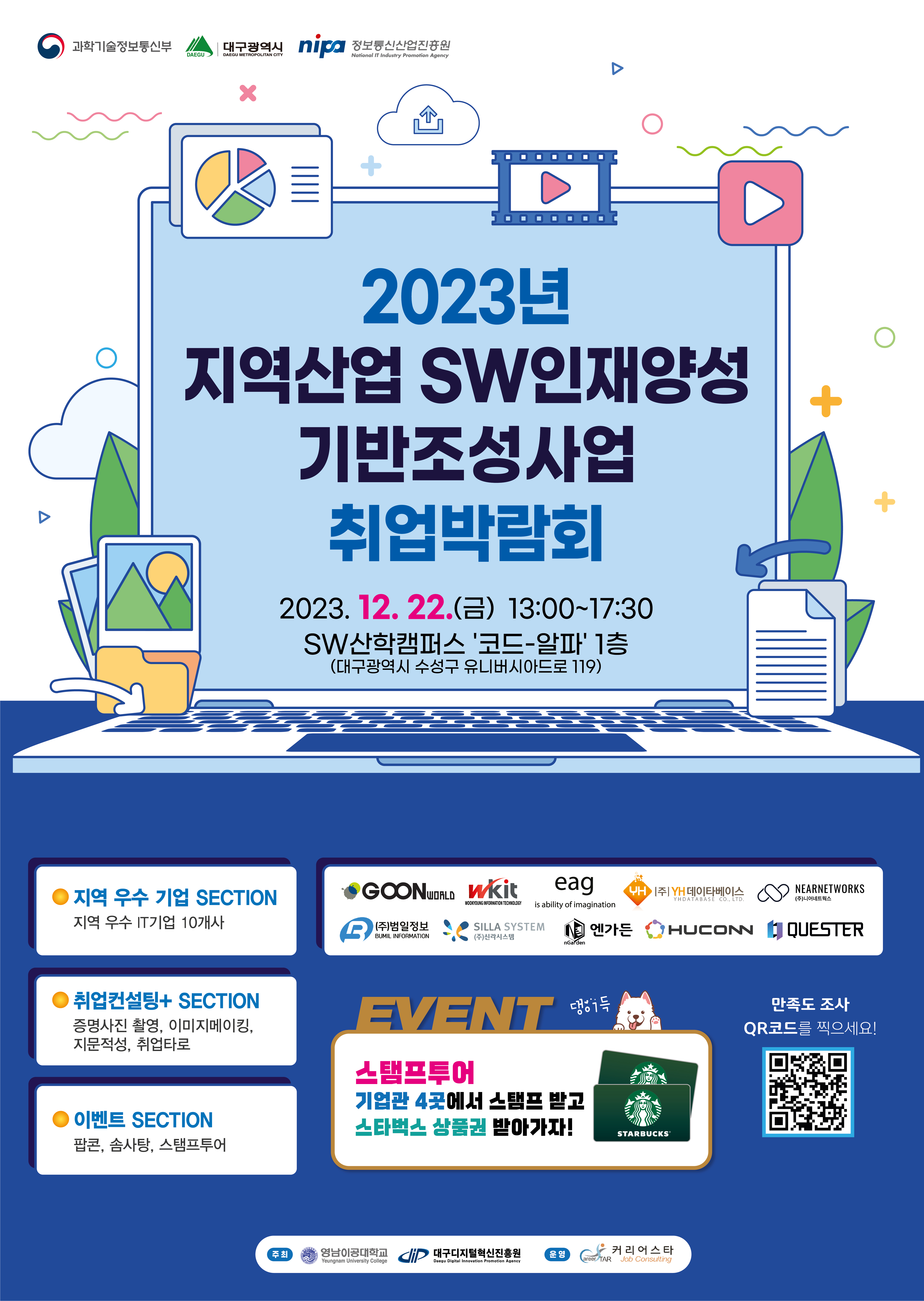 안녕하십니까, 계명대학교 SW인재양성 담당자입니다. 재단법인 대구디지털혁신진흥원에서 주최하는 취업박람회 및 산학캠퍼스 투어 참가자를 모집중이오니, 관심 있으신 학생들의 많은 참여를 부탁드립니다. (상품 있습니다!) 학교에서 버스도 대절해드릴 예정이며 아침/점심 식사도 제공드립니다. (상세일정 붙임3. 참조) 행사개요 1) 행사명: 성과교류회 및 취업박람회 2) 주요내용: 취업트렌드 특별강연 및 취업박람회 3) 참석 대상: 디지털(IT/SW) 분야 취업 희망 학생 4) 일정 및 장소 2023.12.22.(금) 10:00 ~ 17:30 ) / 대구 스마트시티센터 1층 대강당 5) 상세내용: 첨부파일 붙임3. 참조 6) 신청방법: 메일접수(tizr123@kmu.ac.kr) 학번, 학과, 이름 작성하여 보내주시기 바랍니다. 문의처: 053-580-6776 7) 신청기간: 12. 21(목) 까지 선착순 30명 |