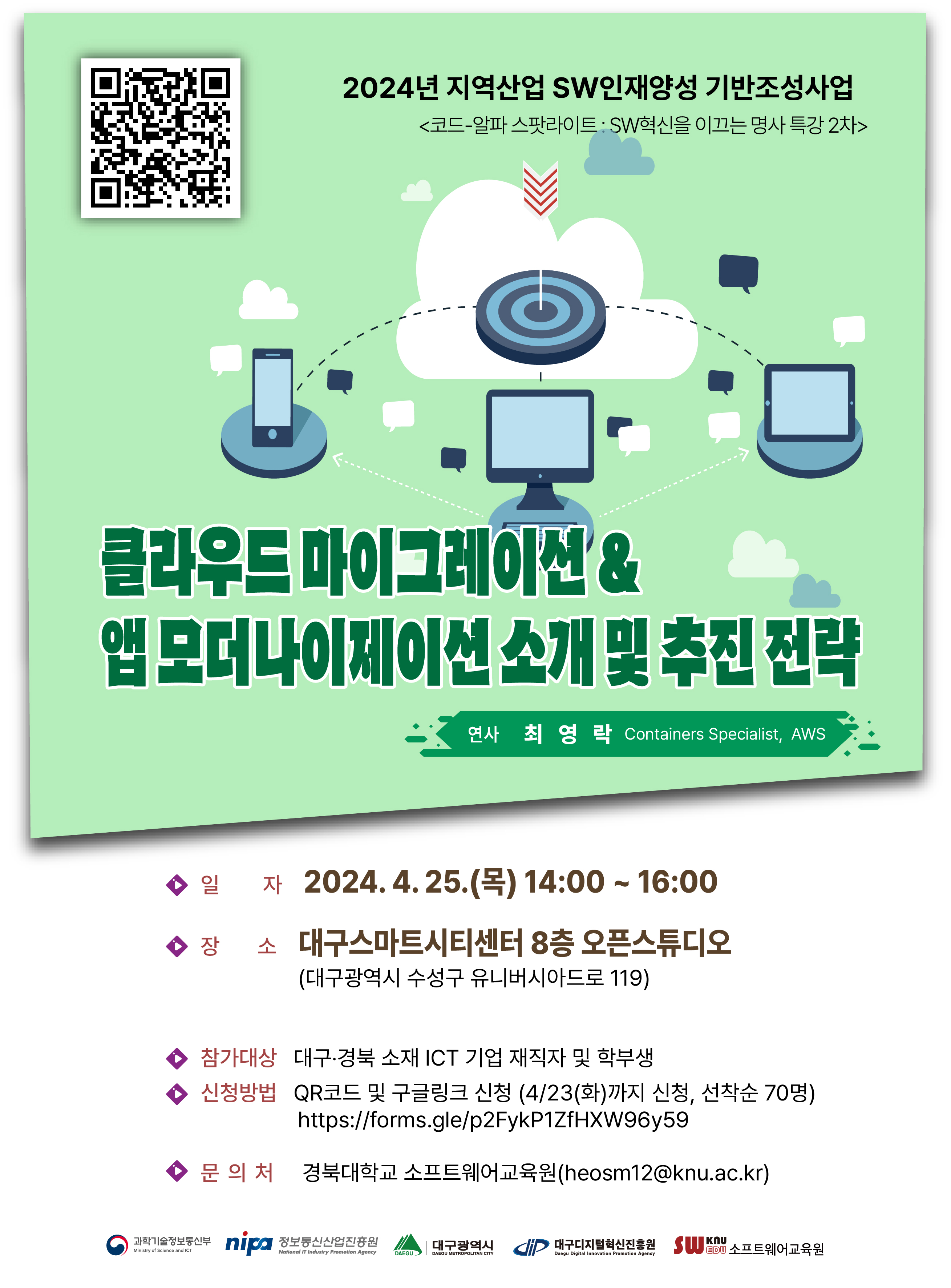 -주제 : 클라우드 마이그레이션 & 앱 모더나이제이션 소개 및 추진 전략 -연사 : 최영락 (Containers Specialist, AWS: Amazon Web Service) -일자 : 2024. 4. 25.(목) 14:00 ~ 16:00 -장소 : 대구스마트시티센터 8층 오픈스튜디오 (대구광역시 수성구 유니버시아드로 119) - 참가대상 : 대구‧경북 소재 ICT 기업 재직자 및 학부생 - 신청방법 : QR코드 및 구글링크 신청 (4/23(화)까지 신청, 선착순 70명) https://forms.gle/p2FykP1ZfHXW96y59