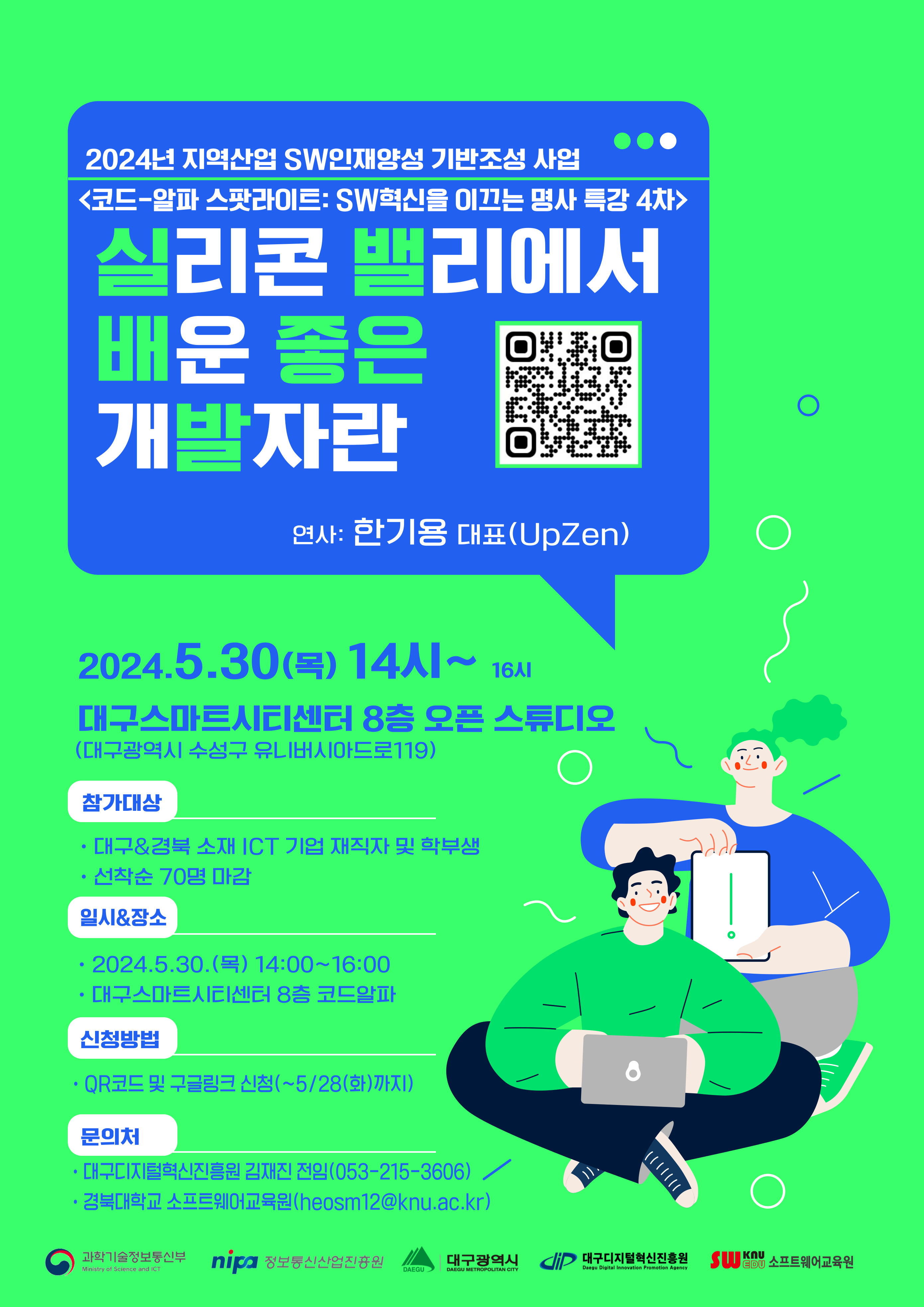 - 신청방법: QR코드 및 구글링크 신청(5/28(화)까지 신청, 선착순 70명) - 문의처 * 대구디지털혁신진흥원 김재진 전임(053-215-3606) * 경북대학교 소프트웨어교육원(heosm12@knu.ac.kr)