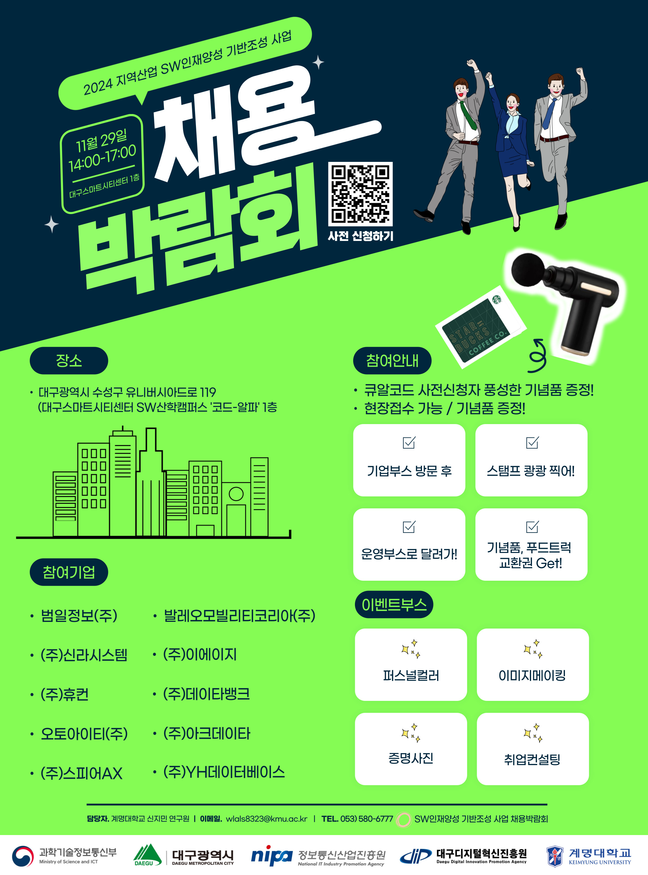 3. 일정 ※ 세부 일정은 사정에 따라 변동 될 수 있음 ▷ 09:00~10:00 계명대학교 산학협력관 → 대구스마트시티센터 이동 ▷ 10:00~11:50 산학 프로젝트 성과공유회 ▷ 11:50~13:00 취업 관련 특별강연 ▷ 13:00~14:00 점심식사 ▷ 14:00~17:00 - 기업채용관: 지역 SW/IT관련 10개社 채용담당자 상담) - 부대행사관: 취업컨설팅(입사지원서 및 면접관련), 증명사진 촬영, 퍼스널컬러 등 - 이벤트관: 스탬프이벤트(기프티콘 증정), 푸드트럭 ▷ 17:00~18:00 대구스마트시티센터 → 계명대학교 산학협력관 이동