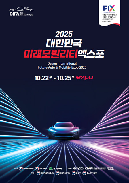 1. 전시회 명: 2025 대한민국 미래모빌리티 엑스포(DIFA) 2. 전시 일자: 2025. 10. 22.(수)~24.(금) 3. 전시 장소: 대구전시컨벤션센터(EXCO)