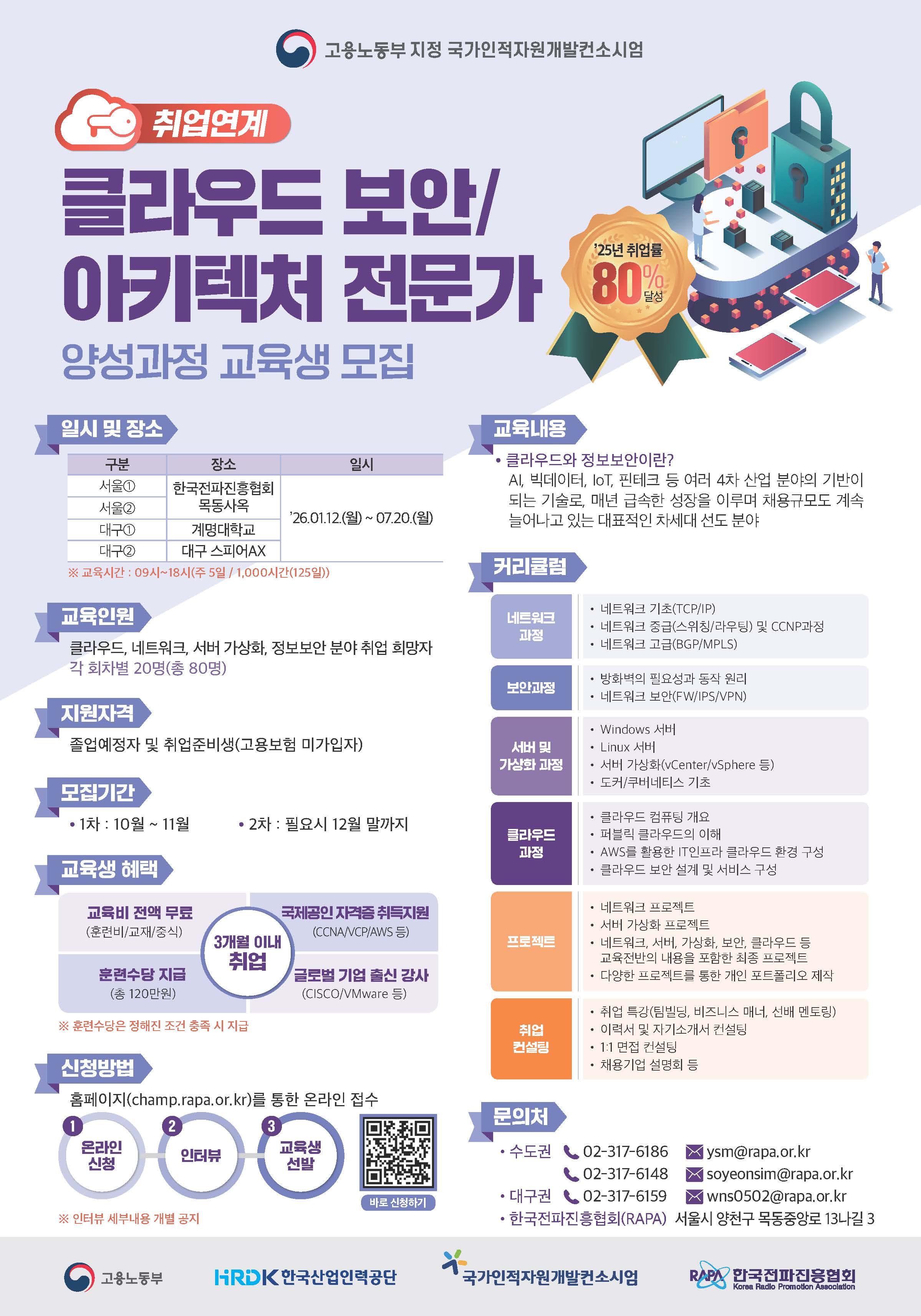 | [인재양성] 2026년 상반기 취업 연계형 클라우드 보안/아키텍처 전문가 양성과정 교육생 모집 | ||