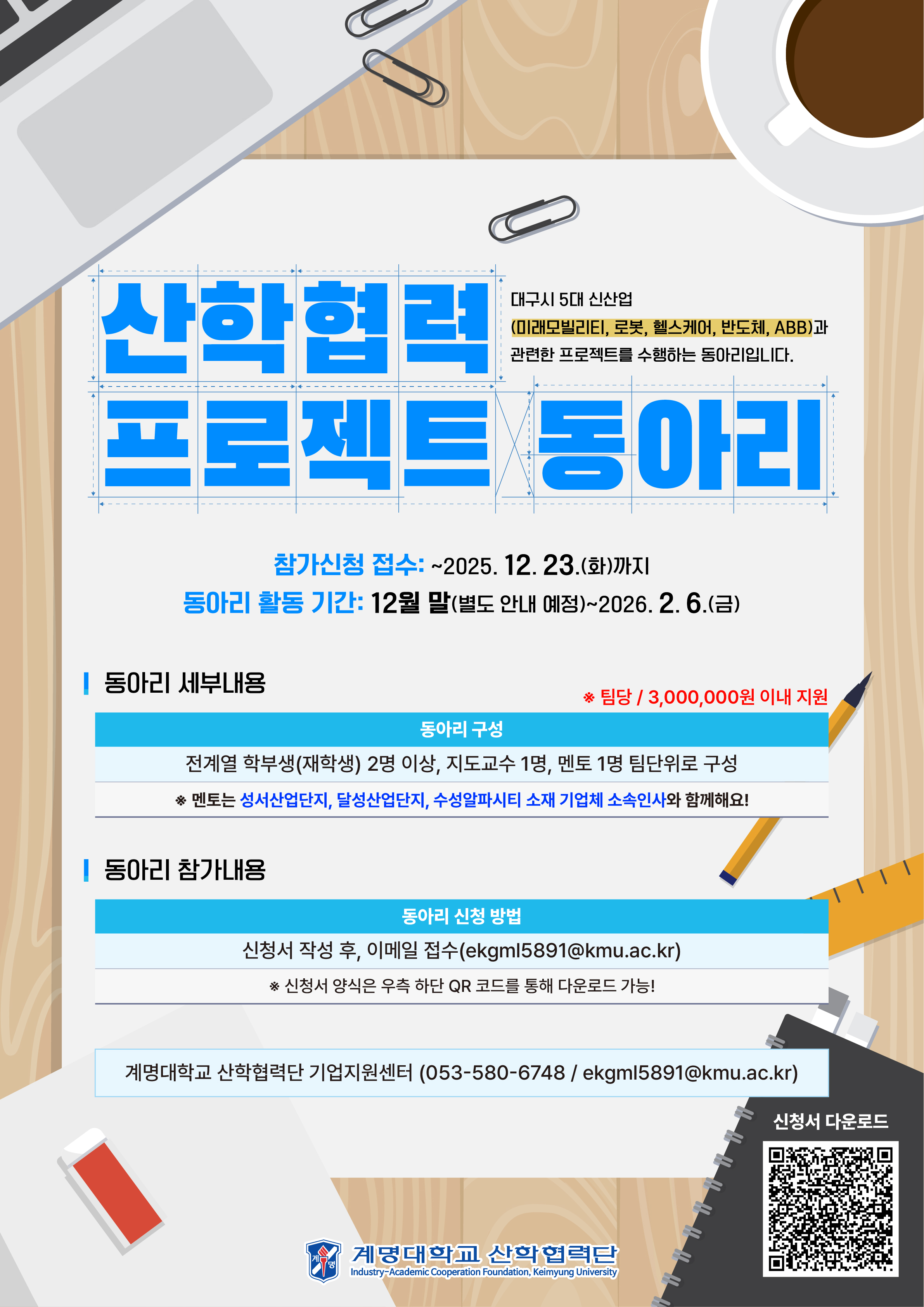 ■ 지원기간: 공고일로부터 ~ 2026. 2. 6.까지 ■ 지원대상: 성서산업단지, 달성산업단지 및 수성알파시티(예정) 내 소재하고 있는 기업 ■ 구성방법: 전계역 학부생(재학생) 5명 내외, 지도교수 1명, 멘토 1명 팀단위로 구성 ※ 멘토: 성서산업단지, 달성산업단지, 수성알파시티 소재 기업체 소속인사 ■ 신청기간: 2025. 12. 23.(화) 까지 ■ 신청방법: 신청서류 작성 후 이메일 제출(ekgml5891@kmu.ac.kr) ■ 신청서류: 참가계획서, 세부활동계획서, 예산집행계획서, 개인정보보호 서약서